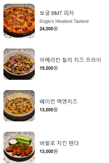 보글하우스 맥주 목록과 대표 안주 이미지 (출처: 보글하우스 네이버 지역정보)