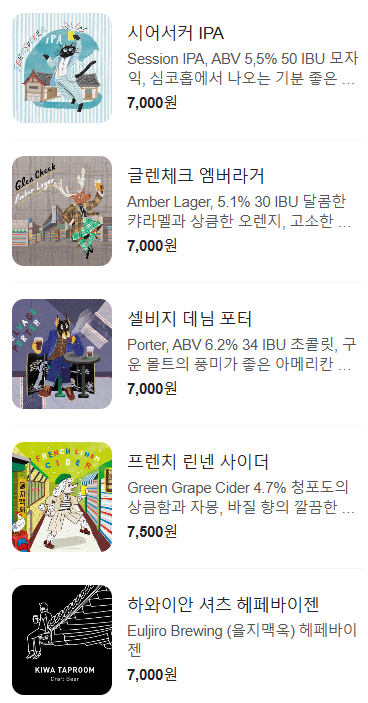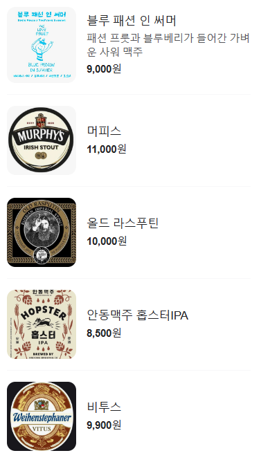 | 맥주 | 국내 수제맥주 위주 | 세계 맥주 다양성 |