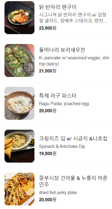 | 안주 구성 | 수제 프라이즈, 감바스, 닭날개 등 맥주와 찰떡 메뉴 다수 |